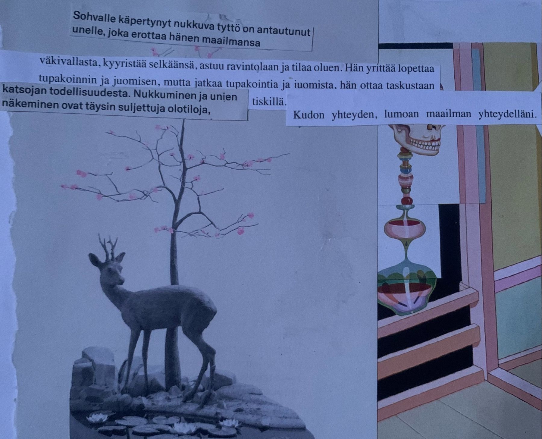 girl curled up on the sofa sleeping has surrendered to a dream which separates their world from violence, crouch their back, steps into a restaurant and orders a beer. they try to stop drinking and smoking but keep on smoking and drinking from their pocket they grab the viewer from reality sleep and dreaming are fully enclosed states of being (on the counter) i weave a connection i enthrall the world with my connection